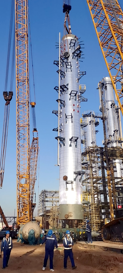 據悉,該塔是甲醇聯合裝置最高、最重的設備,塔分三段到場,本次吊裝的為該塔下段,由850噸履帶吊主吊,450噸履帶吊溜尾,接下來將完成下段環縫的組對焊接,為中、上段安裝創造條件。