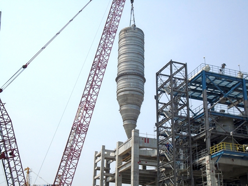 近日, 北京工程公司延能化項目45萬噸/年高密度聚乙烯(HDPE)裝置聚合單元超限設備粉料處理罐(D-2301)吊裝就位。